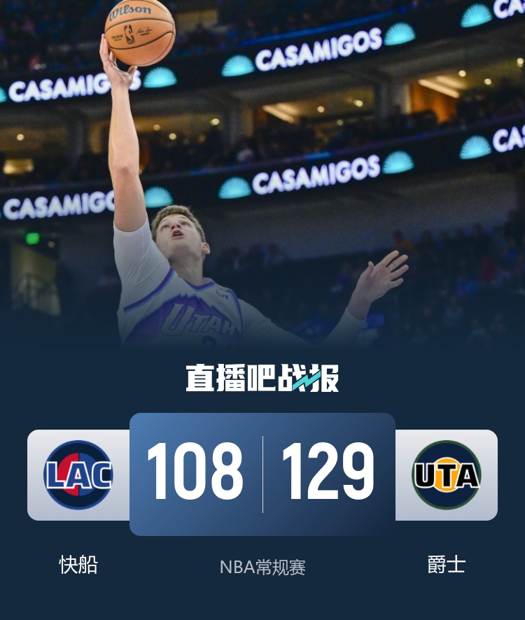 比赛开始,爵士主打内线高度,凯斯勒和马尔卡宁、菲利波夫斯基轮番打成,哈登有攻有传苦苦支撑,但快船连续失误后,爵士继续狂轰乱炸单节43分领先到24分,次节大洛连续3记三分止血,但爵士谁投谁进外线连续回应扩大领先,最后爵士又10-0半场领先到31分。下半场,哈登继续串联球队,小德里克-琼斯连续杀内线单节12分助快船追分,但爵士全民皆兵总能回应,分差保持在30分左右,末节快船换上全替补练兵,爵士始终保持住大比分领先,最终爵士129-108大胜快船。