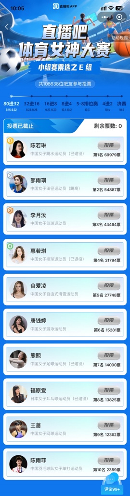 直播吧体育女神大赛E组赛果:陈若琳第一 惠若琪力压谷爱凌晋级